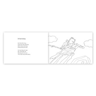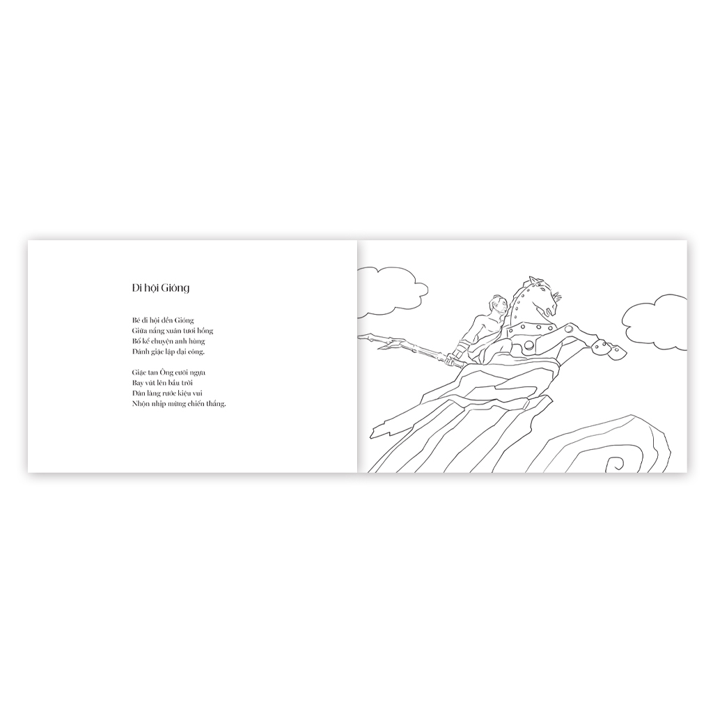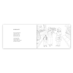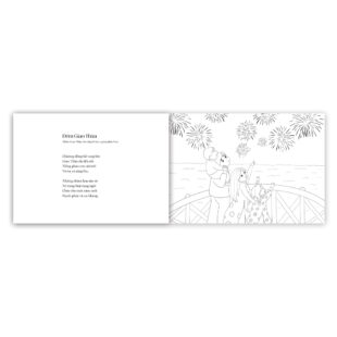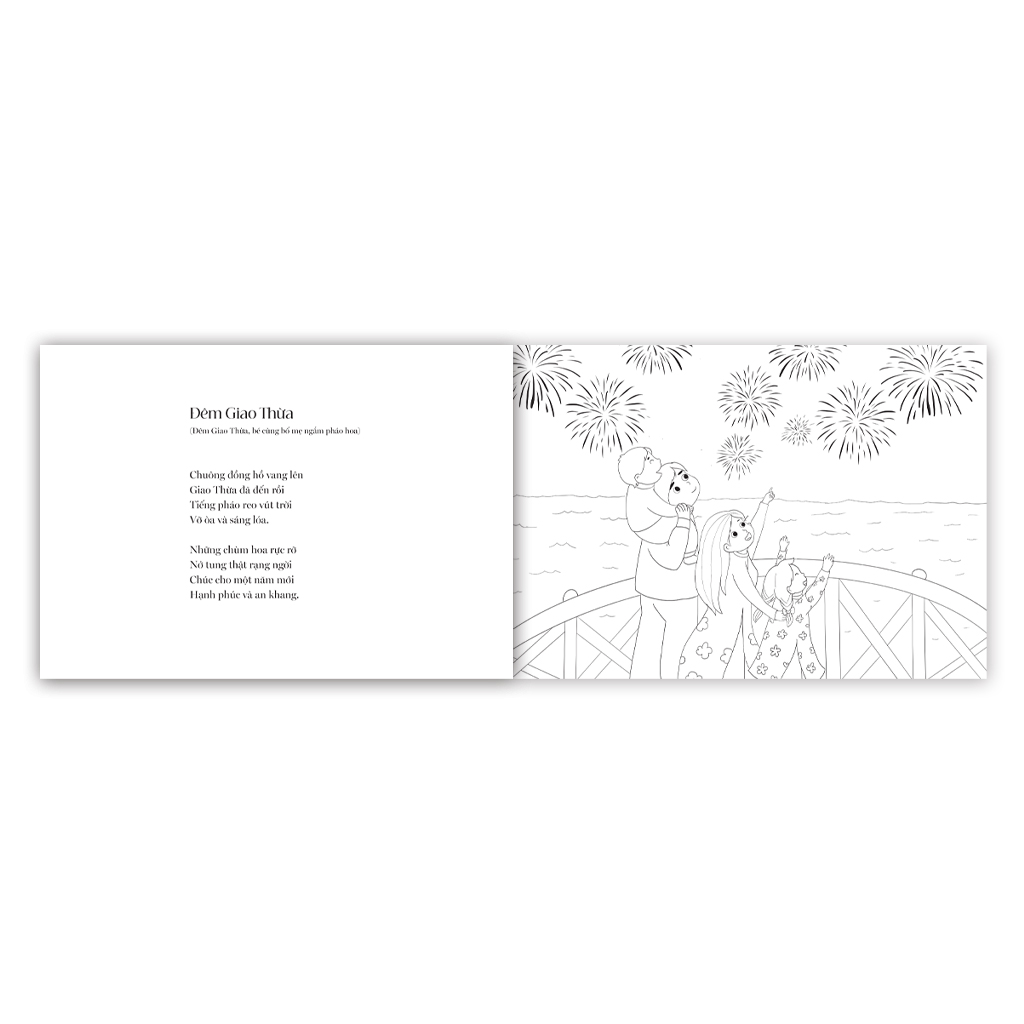 Ngay bên cạnh mỗi bài thơ là một trang tranh trắng đen để bé tự tay tô sắc xuân theo trí tưởng tượng của mình. Mỗi bức tranh hoàn thiện không chỉ là một sản phẩm mỹ thuật nhỏ xinh, mà còn là cảm xúc riêng con gửi vào mùa lễ hội.