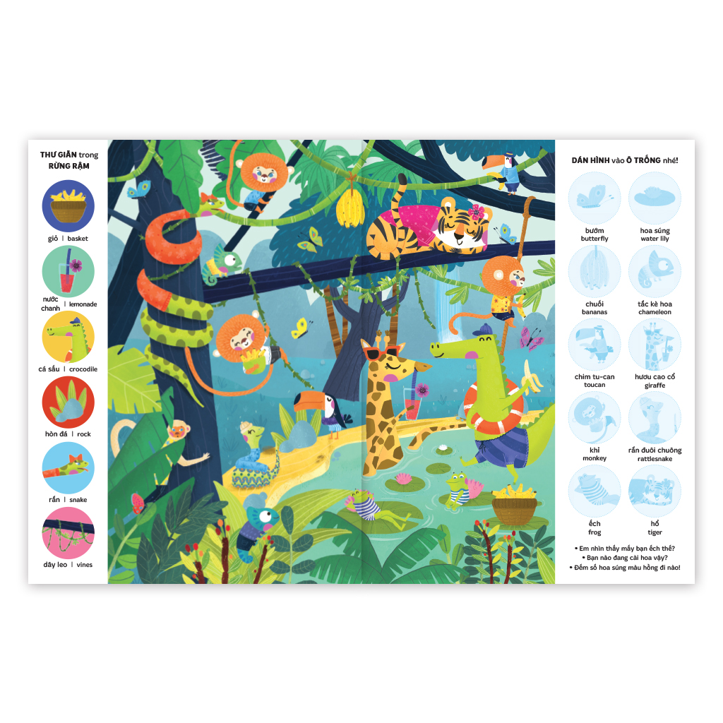 Cuốn sách song ngữ Anh – Việt có 80 hình dán có thể sử dụng nhiều lần, cho phép trẻ hoàn thiện những bức tranh, biến mỗi cảnh quan trở nên sống động hơn.
